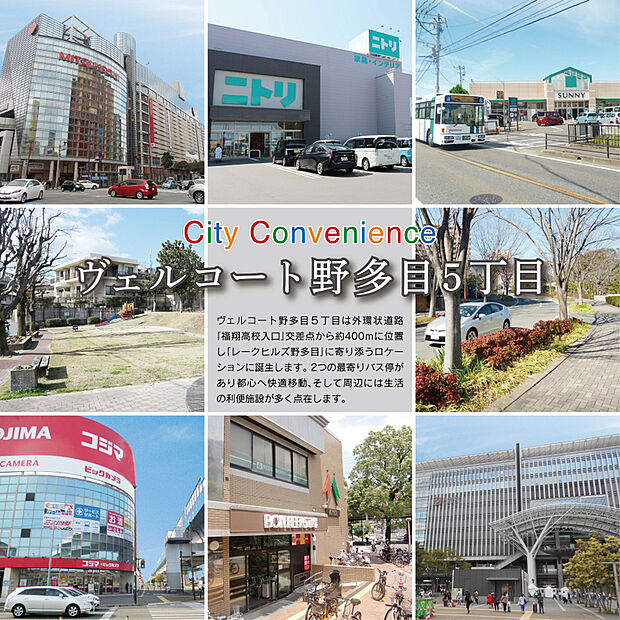 外環状道路「福翔高校入口」交差点から約400mに位置し「レークヒルズの野多目」に寄り添うロケーションに誕生します。 ◆住環境に優れたエリア◆ ・西鉄バス「浦の谷」停 徒歩4分・西鉄バス「レークヒルズ入口」停 徒歩5分・西鉄大牟田線「高宮」駅 車で6分・福岡市都市高速「野多目」IC 車で3分 ◆生活施設が充実し、暮らしやすい街◆ ・ダイキョーバリュー野多目店 徒歩5分・ローソン野多目3丁目店 徒歩4分・ニトリ福岡南店 車で3分・野多目西公園 徒歩4分