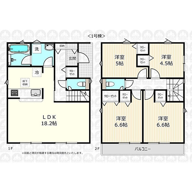 1階に水回りを集約した4LDK/対面キッチンのLDKは広々18.2帖/小学校まで徒歩5分以内/カースペース1台可