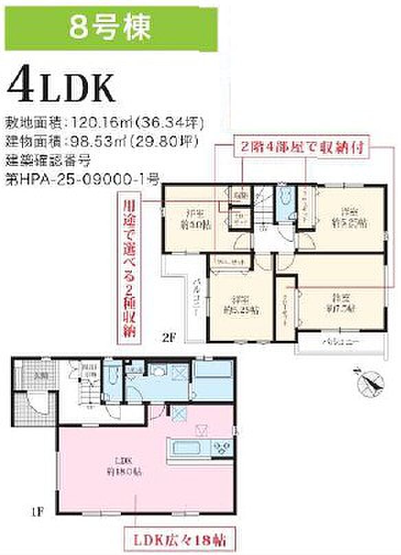 | 間取り | 4LDK 間取り内訳:リビングダイニングキッチン 18帖(1階)・洋室 7.5帖(2階)・洋室 5帖(2階)・洋室 5.2帖(2階)x2 |