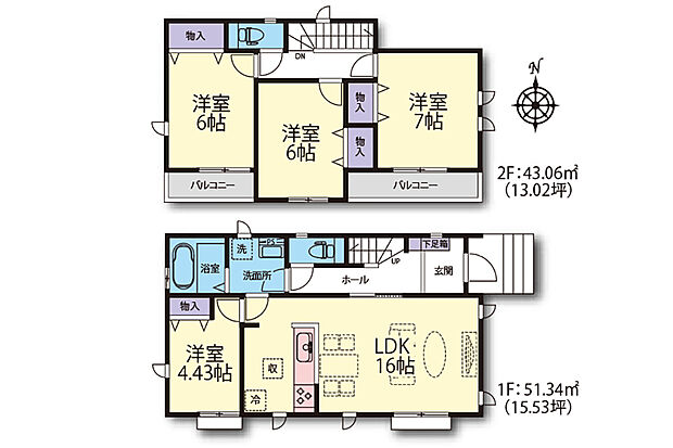 | 間取り | 4LDK 間取り内訳:リビングダイニングキッチン 16帖(1階)・洋室 4.3帖(1階)・洋室 7帖(2階)・洋室 6帖(2階)x2 |