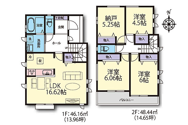 | 間取り | 3SLDK 間取り内訳:リビングダイニングキッチン 16.6帖(1階)・洋室 6帖(2階)・洋室 6帖(2階)・洋室 4.5帖(2階)・収納 5.2帖(2階) |