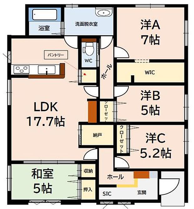 | 間取り | 4LDK 間取り内訳:リビングダイニングキッチン 17.7帖・和室 5畳・洋室 7帖・洋室 5.2帖・洋室 5帖 |