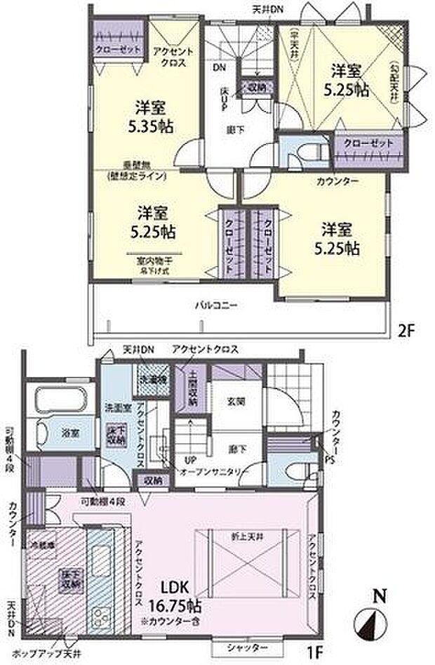| 間取り | 3LDK 間取り内訳:リビングダイニングキッチン 16.7帖(1階)・洋室 5.2帖(2階)・洋室 10.6帖(2階)・洋室 5.2帖(2階) |