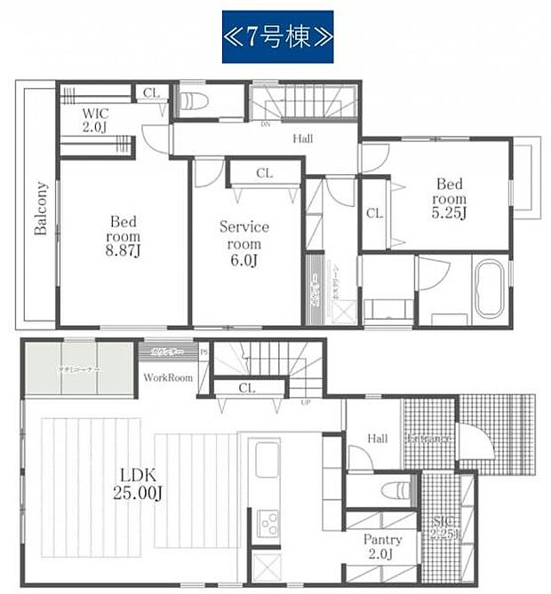 間取り内訳:リビングダイニングキッチン 25帖(1階)・洋室 8.8帖(2階)・洋室 5.2帖(2階)・収納 6帖(2階)