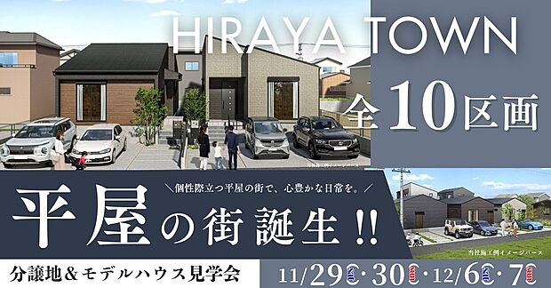【平屋の街 誕生】 全10邸・50坪超、公開3週間早くも3区画ご成約!! 公開からお問い合わせ多数!注目の平屋! 人生に新しい「居心地の良さ」を届ける HIRAYA Style “新しい暮らしが始まる。あらゆる世代のための平屋の街。” ■建物のこだわり ・傾斜天井がもたらす開放感(最大4.0m~2.9m) ・ワンフロアで生活動線が簡潔。毎日の負担を軽減 ■魅力ポイント ・全区画50坪超のゆとりある敷地 ・南道路中心の明るい街並み ・駐車スペース2台以上確保 ・ガーデニング、家庭菜園、ドッグラン、BBQも楽しめる広々庭付き