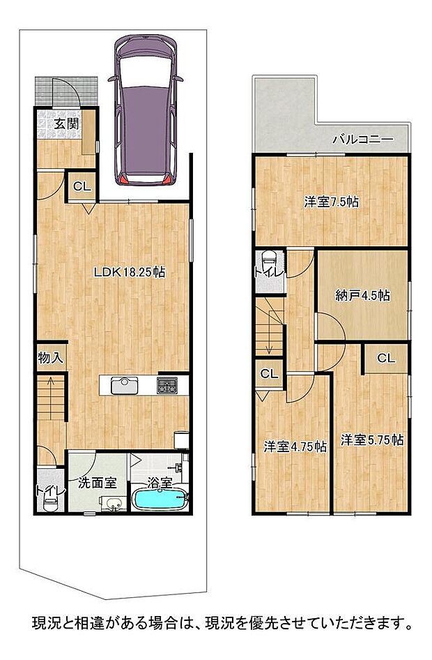 | 間取り | 3SLDK 間取り内訳:リビングダイニングキッチン 18.2帖(1階)・洋室 7.5帖(2階)・洋室 5.7帖(2階)・洋室 4.7帖(2階)・収納 4.5帖(2階) |