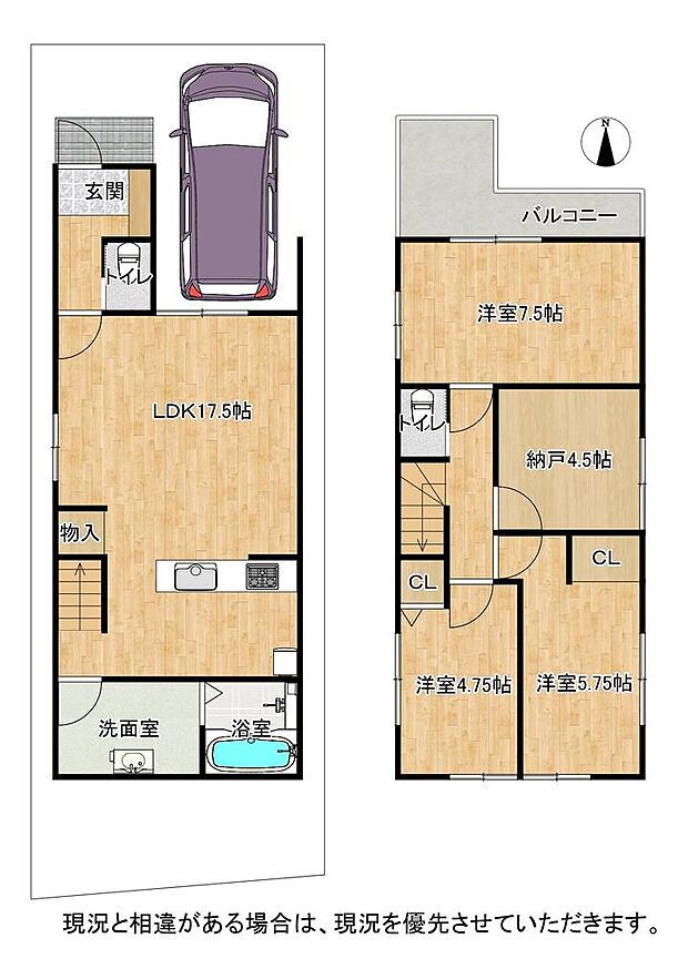 | 間取り | 3SLDK 間取り内訳:リビングダイニングキッチン 17.5帖(1階)・洋室 7.5帖(2階)・洋室 5.7帖(2階)・洋室 4.7帖(2階)・収納 4.5帖(2階) |
