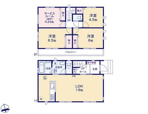 | 間取り | 3SLDK 間取り内訳:リビングダイニングキッチン 19帖(1階)・洋室 6.5帖(2階)・洋室 6帖(2階)・洋室 4.5帖(2階)・収納 5.2帖(2階) |