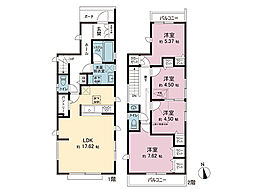 | 間取り | 3LDK 間取り内訳:洋室 6.5帖(2階)・洋室 5.7帖(2階)・洋室 5.2帖(2階)・リビングダイニングキッチン 16帖(1階) |