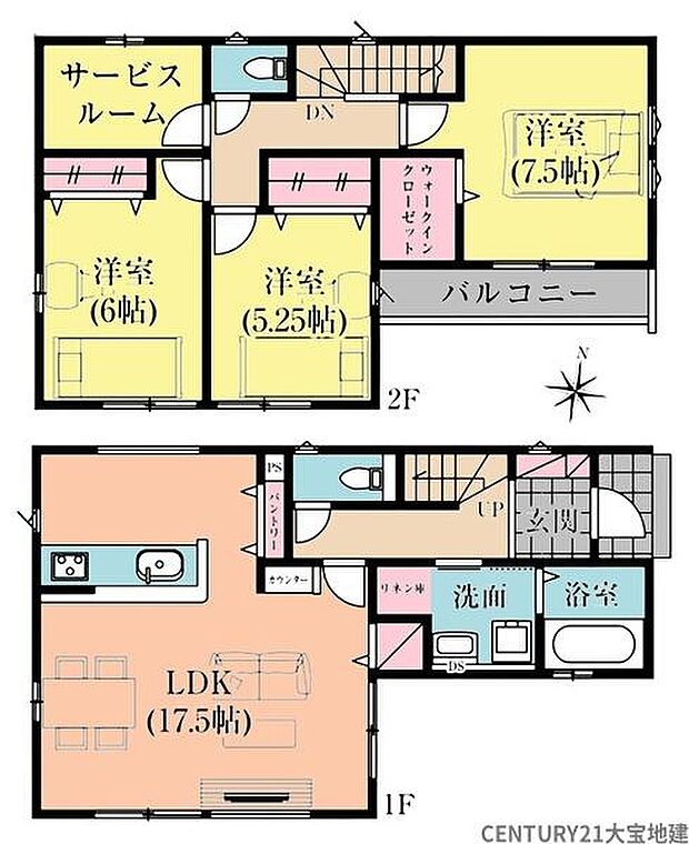 | 間取り | 3LDK 間取り内訳:リビングダイニングキッチン 17.5帖(1階)・洋室 7.5帖(2階)・洋室 6帖(2階)・洋室 5.2帖(2階) |