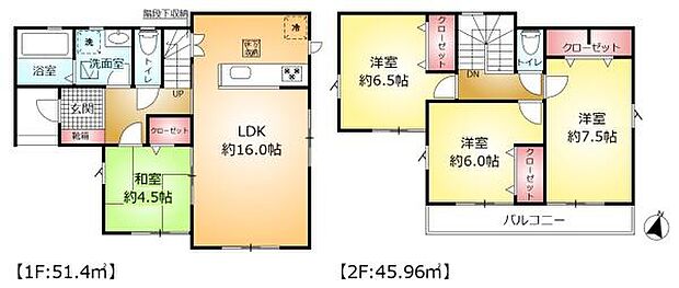 | 間取り | 4LDK 間取り内訳:リビングダイニングキッチン 16帖(1階)・和室 4.5畳(1階)・洋室 7.5帖(2階)・洋室 6帖(2階)・洋室 6.5帖(2階) |