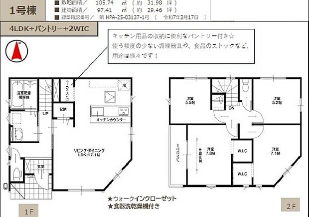 間取り内訳:リビングダイニングキッチン 17.1帖(1階)・洋室 5.2帖(2階)・洋室 7.1帖(2階)・洋室 7.8帖(2階)・洋室 5.5帖(2階)