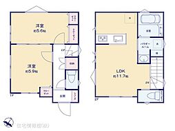 | 間取り | 2LDK 間取り内訳:洋室 5.9帖(1階)・洋室 5.6帖(1階)・リビングダイニングキッチン 11.7帖(2階) |