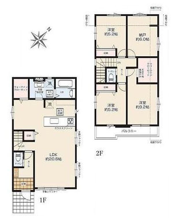 | 間取り | 3SLDK 間取り内訳:リビングダイニングキッチン 20.6帖(1階)・洋室 5.2帖(2階)・洋室 5.2帖(2階)・洋室 9.2帖(2階)・収納 6帖(2階) |