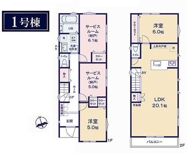| 間取り | 2SLDK 間取り内訳:洋室 5帖(1階)・収納 6.1帖(1階)・収納 5帖(1階)・リビングダイニングキッチン 20.1帖(2階)・洋室 6帖(2階) |