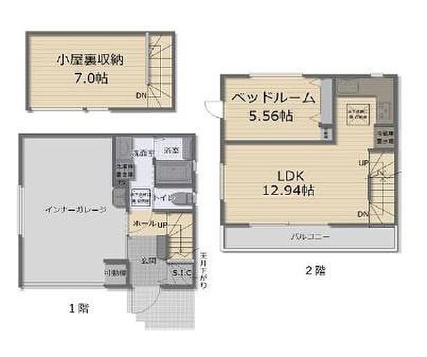 | 間取り | 1SLDK 間取り内訳:リビングダイニングキッチン 12.9帖(2階)・洋室 5.5帖(2階) |