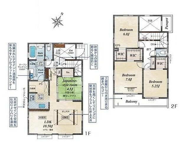 間取り内訳:リビングダイニングキッチン 18.5帖(1階)・和室 4.5畳(1階)・洋室 6帖(2階)・洋室 7帖(2階)・洋室 5.2帖(2階)