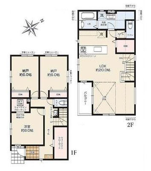 | 間取り | 1SLDK 間取り内訳:収納 6帖(1階)・収納 6帖(1階)・洋室 8帖(1階)・リビングダイニングキッチン 20帖(2階) |