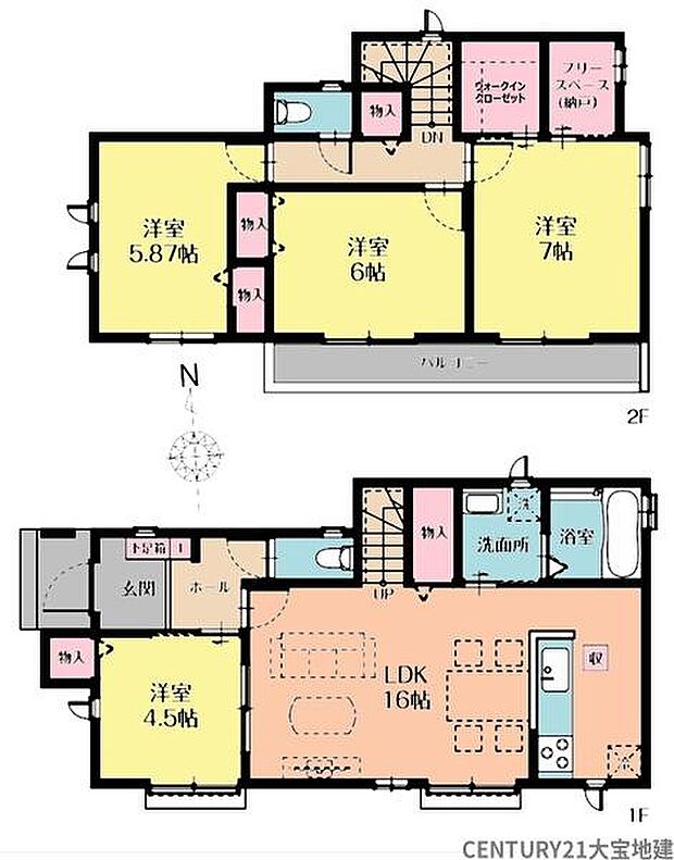 | 間取り | 4SLDK 間取り内訳:洋室 6帖(2階)・洋室 5.8帖(2階)・リビングダイニングキッチン 16帖(1階)・洋室 4.5帖(1階)・洋室 7帖(2階) |