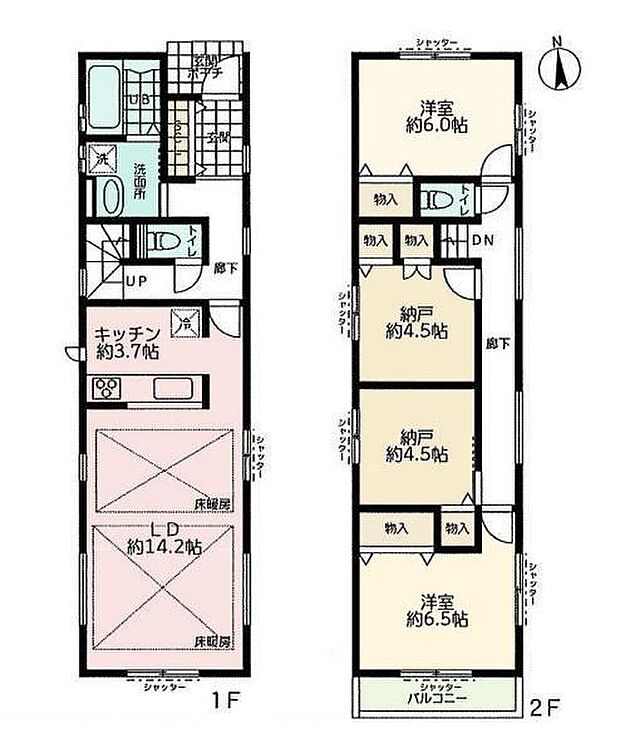 | 間取り | 2SLDK 間取り内訳:リビングダイニングキッチン 17.9帖(1階)・洋室 6帖(2階)・収納 4.5帖(2階)・収納 4.5帖(2階)・洋室 6.5帖(2階) |