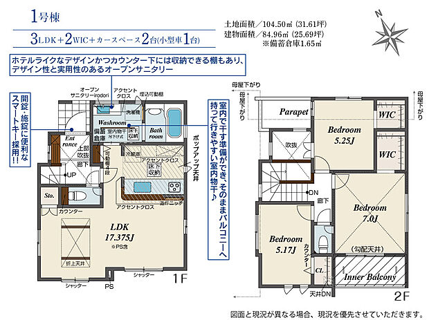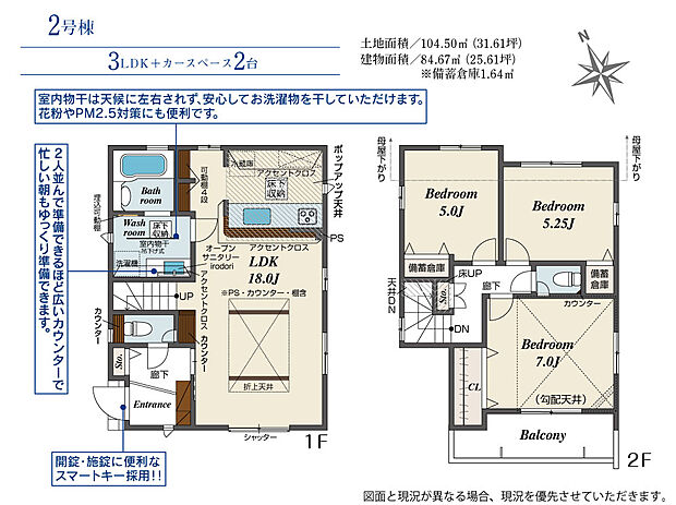建物面積 84.67m2(約25.61坪)~84.96m2(約25.70坪)