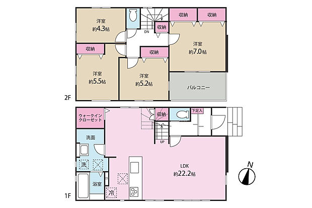 | 間取り | 4LDK 間取り内訳:リビングダイニングキッチン 22.2帖(1階)・洋室 7帖(1階)・洋室 5.2帖(1階)x2・洋室 4.3帖(1階) |