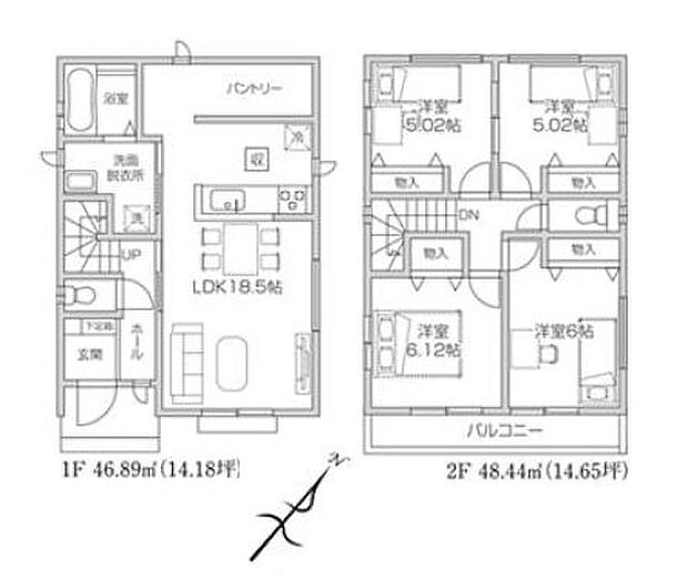 | 間取り | 4LDK 間取り内訳:洋室 7.5帖(2階)・洋室 6帖(2階)・洋室 5帖(2階)・洋室 5帖(2階)・リビングダイニングキッチン 18.5帖(1階) |