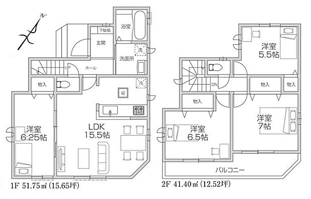 | 間取り | 4LDK 間取り内訳:洋室 7帖(2階)・洋室 6.5帖(2階)・洋室 5.5帖(2階)・洋室 6.2帖(1階)・リビングダイニングキッチン 15.5帖(1階) |