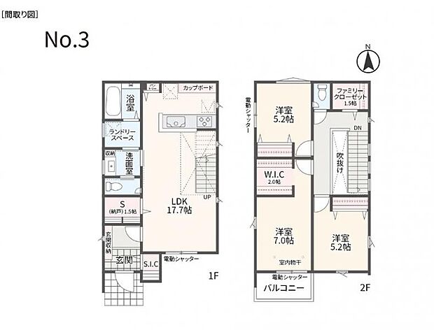 | 間取り | 3SLDK 間取り内訳:リビングダイニングキッチン 17.7帖(1階)・収納 1.5帖(1階)・洋室 7帖(2階)・洋室 5.2帖(2階)x2 |