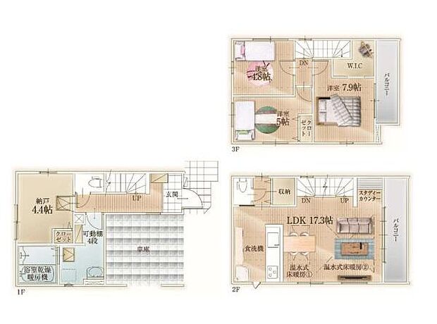 | 間取り | 3SLDK 間取り内訳:収納 4.4帖(1階)・リビングダイニングキッチン 17.3帖(2階)・洋室 4.8帖(3階)・洋室 5帖(3階)・洋室 7.9帖(3階) |