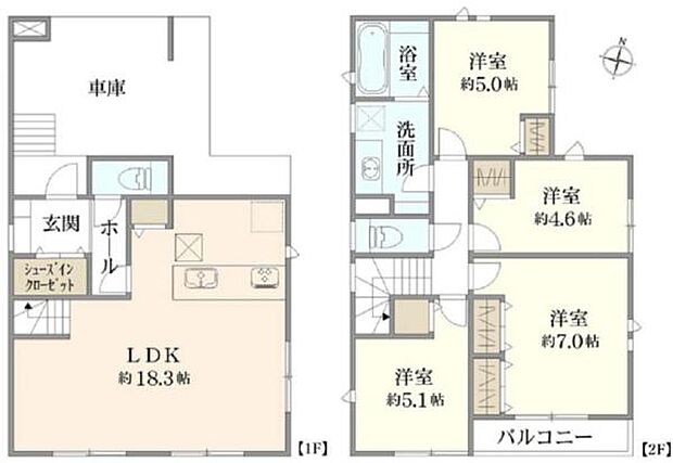 | 間取り | 4LDK 間取り内訳:リビングダイニングキッチン 18.3帖(1階)・洋室 7帖(2階)・洋室 5.1帖(2階)・洋室 5帖(2階)・洋室 4.6帖(2階) |