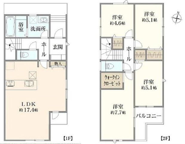 間取り内訳:リビングダイニングキッチン 17.4帖(1階)・洋室 7.7帖(2階)・洋室 5.1帖(2階)・洋室 5.1帖(2階)・洋室 4.6帖(2階)