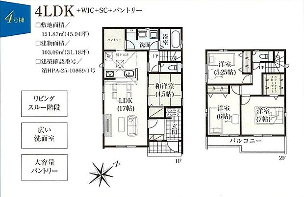 | 間取り | 4LDK 間取り内訳:リビングダイニングキッチン 17帖・和室 4.5畳・洋室 7帖・洋室 6帖・洋室 5.2帖 |