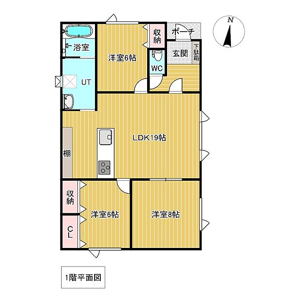 | 間取り | 3LDK 間取り内訳:リビングダイニングキッチン 19帖(1階)・洋室 8帖(1階)・洋室 6帖(1階)・洋室 6帖(1階) |