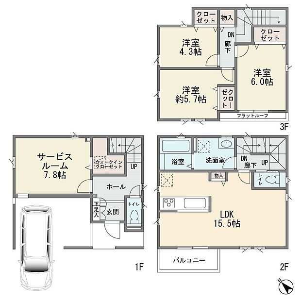| 間取り | 3SLDK 間取り内訳:収納 7.8帖・リビングダイニングキッチン 15.5帖・洋室 6帖・洋室 5.7帖・洋室 4.3帖 |