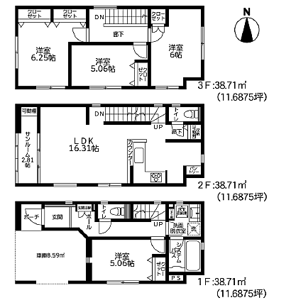間取り内訳:リビングダイニングキッチン 16.1帖(2階)・洋室 5.2帖(1階)・洋室 5.2帖(3階)・洋室 6帖(3階)・洋室 6.3帖(3階)