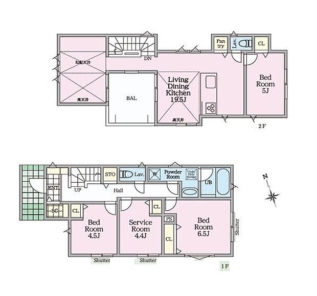 | 間取り | 3SLDK 間取り内訳:洋室 6.5帖(1階)・収納 4.4帖(1階)・洋室 4.5帖(1階)・洋室 5帖(2階)・リビングダイニングキッチン 19.5帖(2階) |