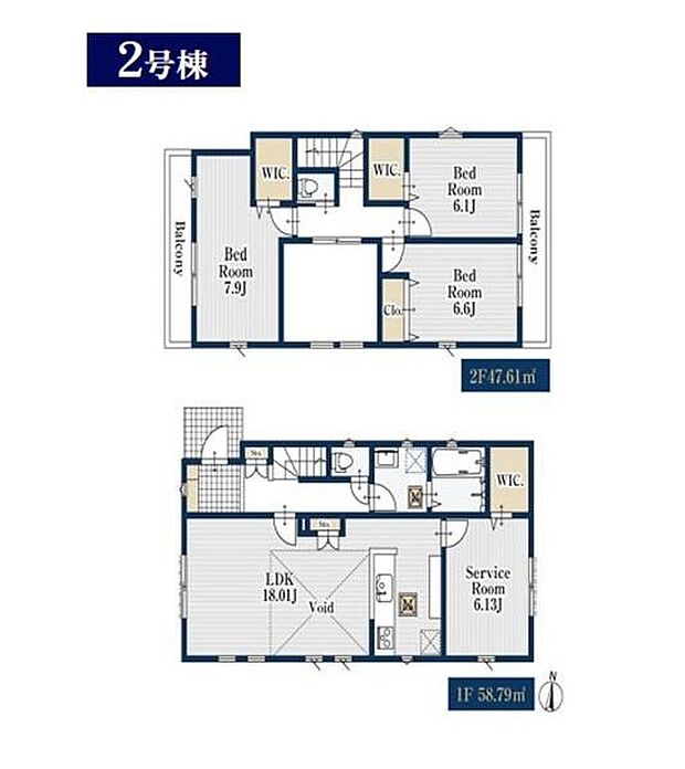 | 間取り | 3SLDK 間取り内訳:リビングダイニングキッチン 18帖(1階)・収納 6.1帖(1階)・洋室 7.9帖(2階)・洋室 6.6帖(2階)・洋室 6.1帖(2階) |