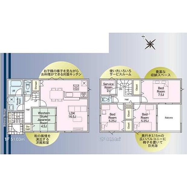 間取り内訳:リビングダイニングキッチン 16.5帖(1階)・和室 4.5畳(1階)・洋室 7.5帖(2階)・洋室 5.2帖(2階)・洋室 5.2帖(2階)