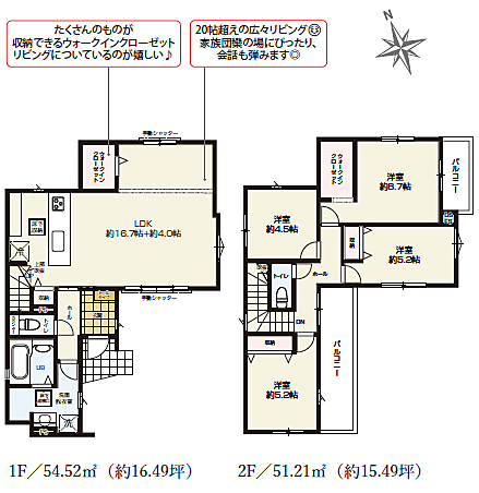| 間取り | 4LDK 間取り内訳:リビングダイニングキッチン 20.7帖(1階)・洋室 8.7帖(2階)・洋室 5.2帖(2階)x2・洋室 4.5帖(2階) |