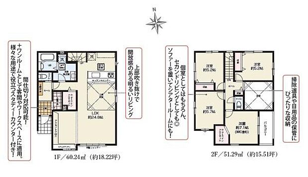 | 間取り | 4LDK 間取り内訳:リビングダイニングキッチン 24.8帖(1階)・洋室 7.1帖(2階)・洋室 5.7帖(2階)・洋室 5.2帖(2階)・洋室 5.2帖(2階) |