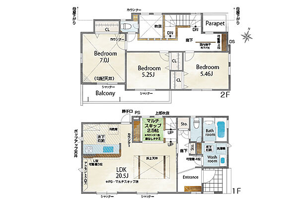 | 間取り | 4LDK 間取り内訳:リビングダイニングキッチン 20.5帖(1階)・洋室 7帖(2階)・洋室 5.4帖(2階)・洋室 5.2帖(2階) |