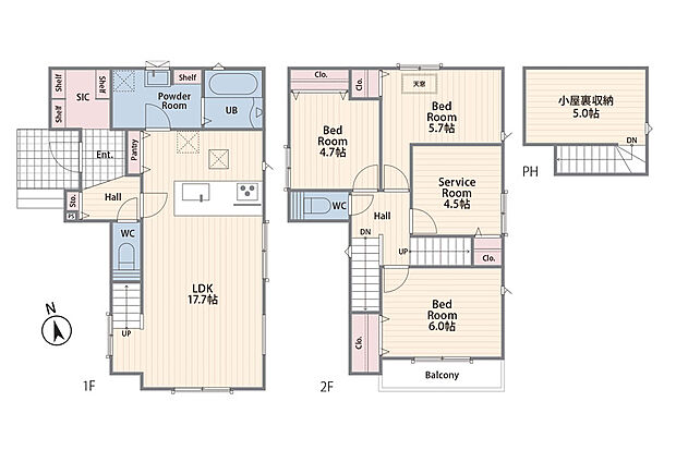 | 間取り | 3SLDK 間取り内訳:洋室 6帖(2階)・洋室 5.7帖(2階)・洋室 4.7帖(2階)・収納 4.5帖(2階)・リビングダイニングキッチン 17.7帖(1階) |