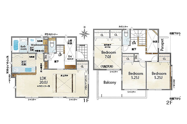 | 間取り | 4LDK 間取り内訳:リビングダイニングキッチン 20帖(1階)・洋室 7帖(1階)・洋室 5.2帖(2階)x2 |