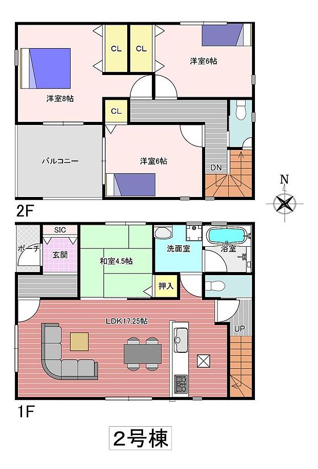 間取り内訳:リビングダイニングキッチン 17.2帖(1階)・和室 4.5畳(1階)・洋室 6帖(2階)・洋室 6帖(2階)・洋室 8帖(2階)
