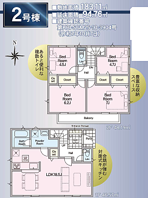 | 間取り | 4LDK 間取り内訳:リビングダイニングキッチン 18.5帖(1階)・洋室 7帖(2階)・洋室 6.2帖(2階)・洋室 4.7帖(2階)・洋室 4.5帖(2階) |