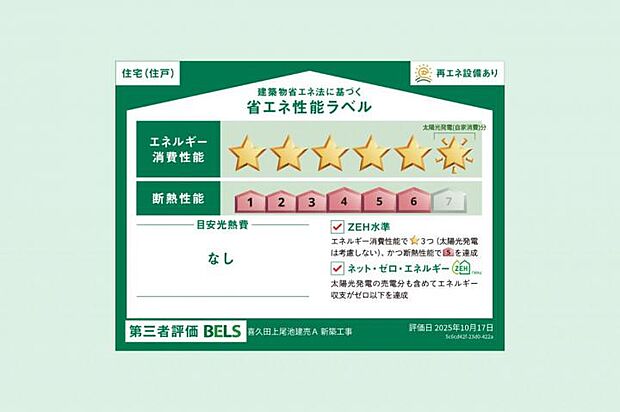 - 星マークの数が多いほどエネルギー消費性能が高いことを示しています。再エネ設備のない住宅は★0~★4の5段階評価、再エネ設備がある住宅は★0~★6の7段階評価となります。