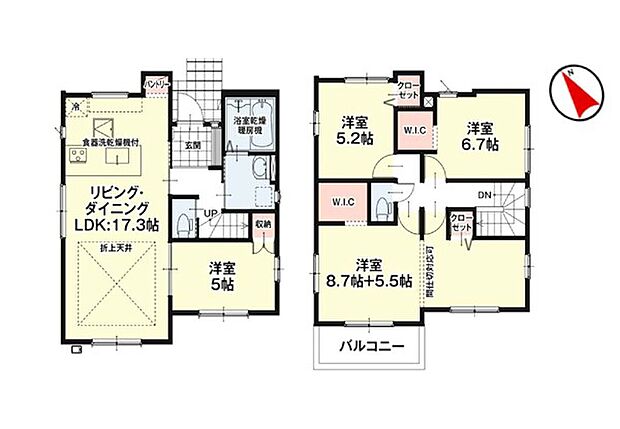 設備:都市ガス 公営水道 下水 駐車場2台以上 整形地 前道6m以上 駐車場1台 対面キッチン 食器洗い機付き コンロ口数三口 浴室乾燥機 トイレ2ヶ所 浴室暖房 2階建 LDK15畳以上 LDK18畳以上 LDK20畳以上 間取り変更可能 採光3面 全室2面採光 全室フローリング ウォークインクローゼット 床下収納 シューズインクローク モニタ付きインターフォン