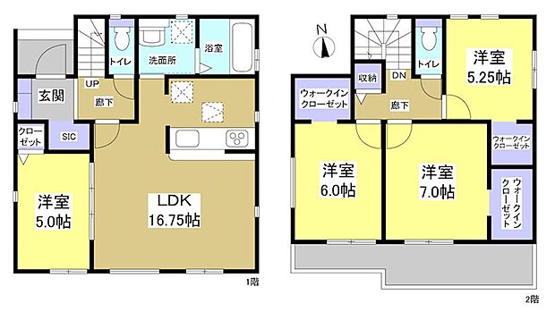 間取り内訳:リビングダイニングキッチン 16.7帖(1階)・洋室 5帖(1階)・洋室 0.7帖(2階)・洋室 6帖(2階)・洋室 5.2帖(2階)