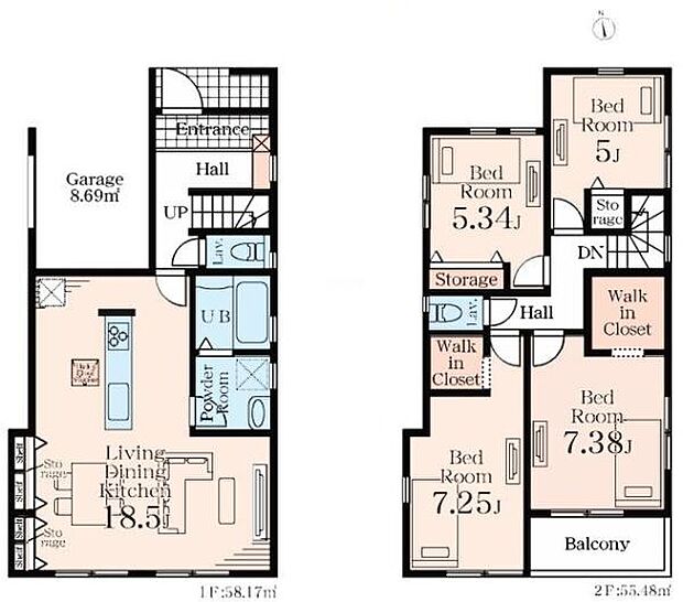 | 間取り | 4LDK 間取り内訳:リビングダイニングキッチン 18.5帖(1階)・洋室 5.3帖(2階)・洋室 5帖(2階)・洋室 7.2帖(2階)・洋室 7.3帖(2階) |